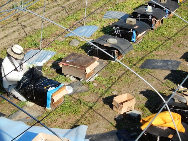 秩父の厳しい冬がやってくる前に、ミツバチたちが寒いことのないように毛布や発泡スチロールで暖かくしています。