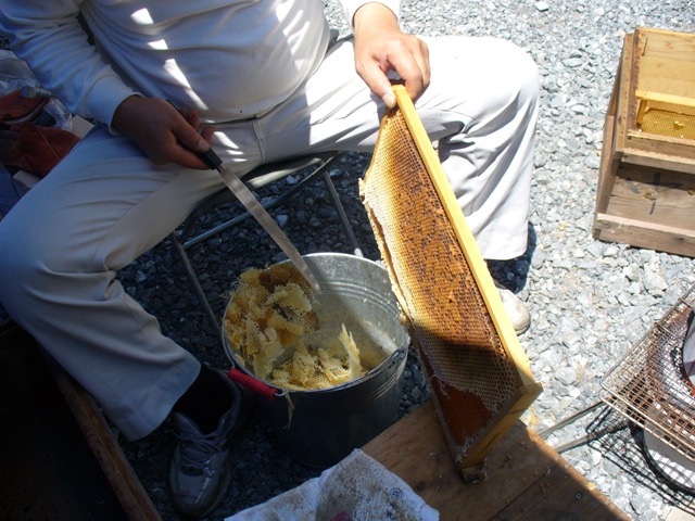 白くなっているのは蜜蓋といいます。蜜蓋がしてないと、糖度があがらず採蜜できません。ナイフで蜜蓋をとって分離器にかけます。
