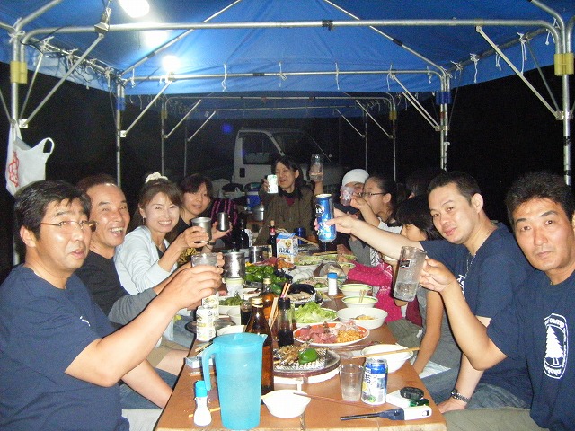 7月最後の土曜日の夜、いつものようにワイワイとしていて、雨が降ってきて気持ちイイと言い濡れながら焼肉たべていたら、風もでてきて・・・・ 食べるのを中断して管理棟に避難しました。王冠で食べるのを途中でやめたのは初めてでした。