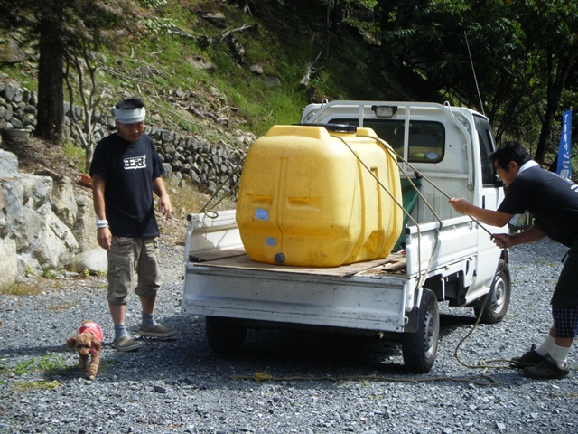 黄色いタンクに水を入れていったり、きたりと水をまきます。